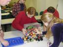 Abe cleaned house and brought another brand of construction toy bricks. Nate, Magnus, and Aaron look for LEGO® elements in the pile.
