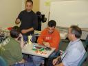 Abe brought anker–stønes, a construction toy from Germany. Christina, Cris, and Greg check them out.